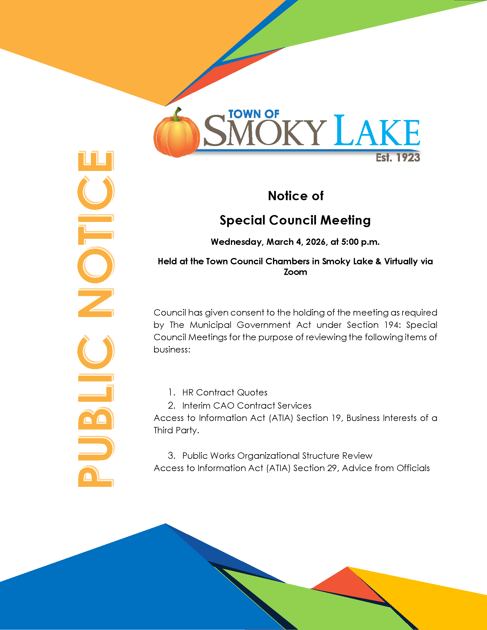 Notice of Special Council Meeting Wednesday, March 4, 2026, at 5:00 p.m When: Wednesday, March 4, 2026 at 5:00 PM Special Council Meeting